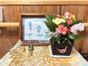 写真は、いつもお世話になっている「花の春風」さんに作っていただいたお正月のアレンジメントです。