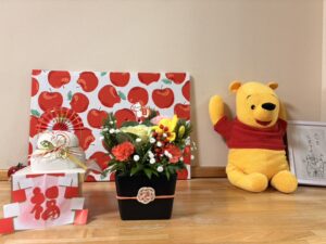写真は、いつもお世話になっている「花の春風」さんに作っていただいたお正月のアレンジメントです。